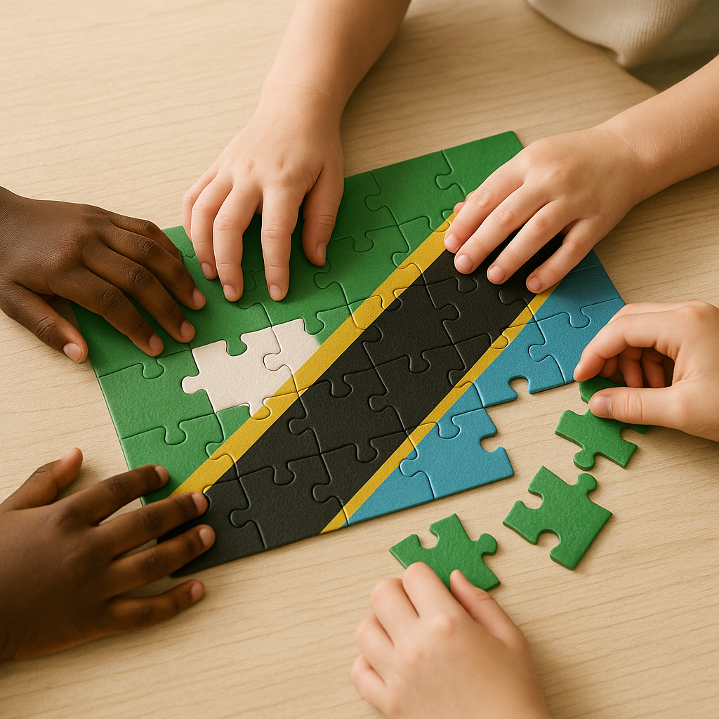 This educational puzzle introduces children to the flag of Tanzania, one of the countries where Lema Plan International supports access to education and learning opportunities. It encourages children to explore Tanzania’s unique colors, geography, and cultural diversity while strengthening their memory, focus, and problem-solving skills through interactive play.